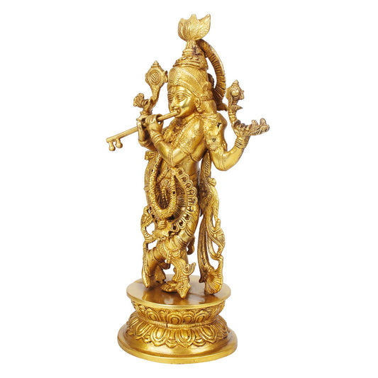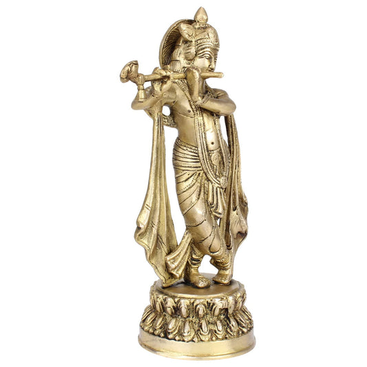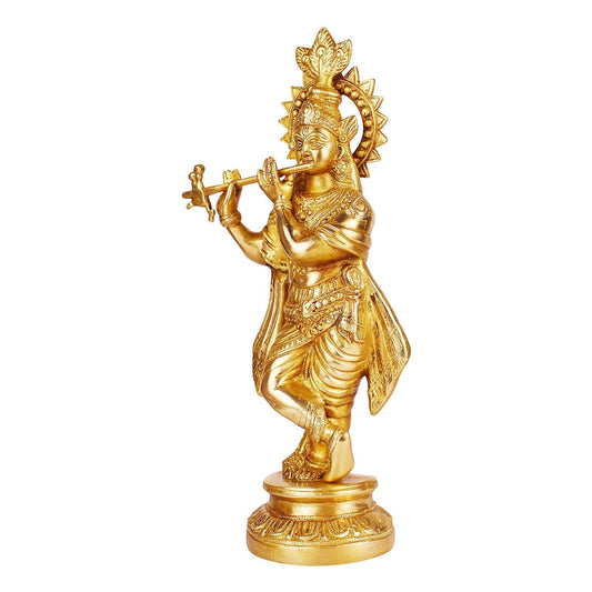 Brass Lord Krishna Statue Krishan Playing Flute Home Decor for Living Room Pooja Gift Item Gold Color Height 13.5 Inch