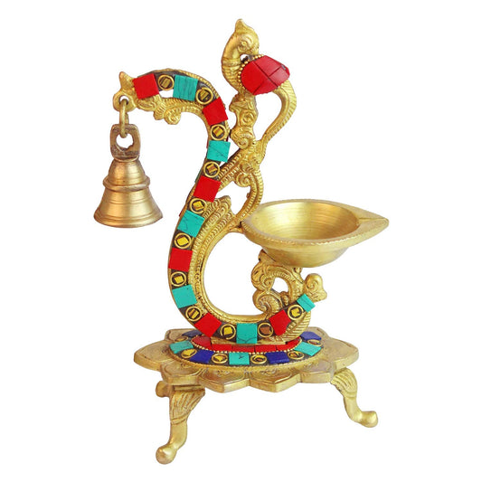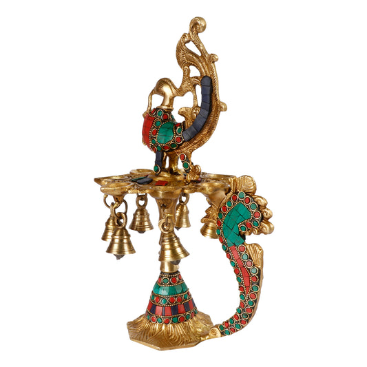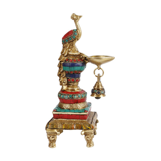 Brass Multicolor Stone Chip Peacock Decorative Diya with Antique Deepak Stand Design: A stunning table decor item