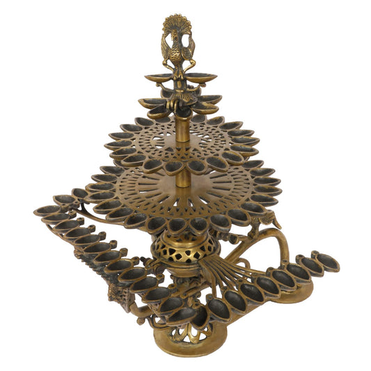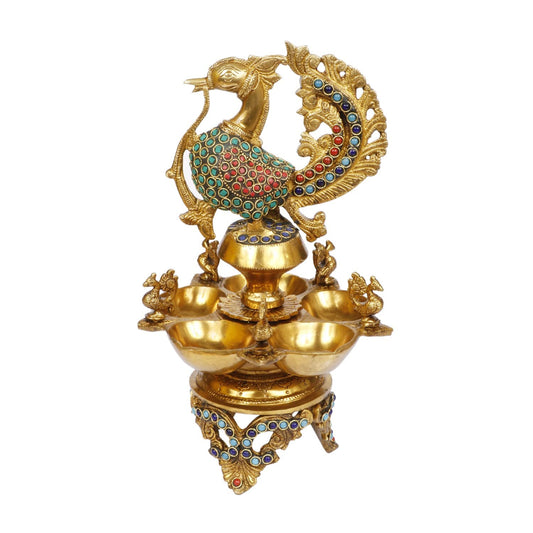 Brass Multi Diya Table Stand Diya With Peacock Perched on Central Pillar Deepam for Home Entrance Decor
