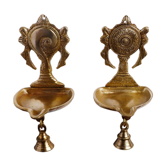 Set of 2 Gold Color Brass Shankha-Chakra Diyas: Perfect for Puja, Aarti, Camphor Burning, and Table Stand. Each is 7 Inch