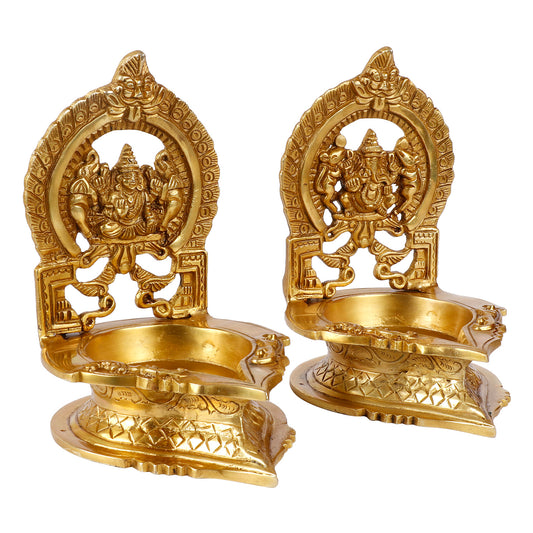 Set of 2 Gold Color Brass Laxmi Ganesh Oil Diyas: Perfect for Puja, Aarti, Camphor Burning, and Table Stand