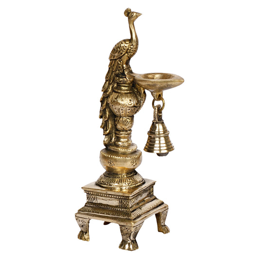 Brass Bell Diya for Puja Room Peacock-Theme Designer Deepak Deepam Lotus Stand Home Decor Decorative Showpiece Return gift