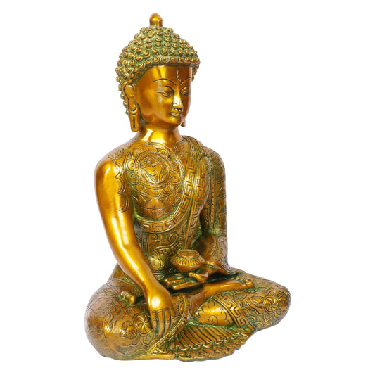 Brass Buddha Idol in Bhumisparsha Mudra Statue Tibetan Buddhist Décor Height 12 Inch Weight 6 Kg Color Golden Green
