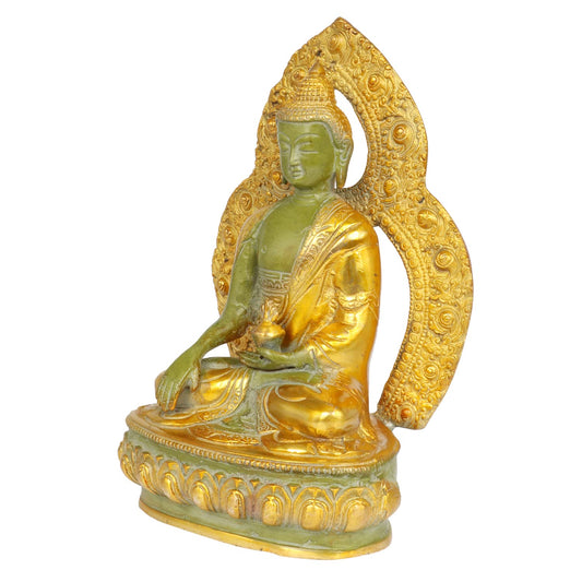 Brass Buddha Idol in Bhumisparsha Mudra Statue Tibetan Buddhist Décor Height 9.5 Inch Weight 2.7 Kg Color Gold and Green