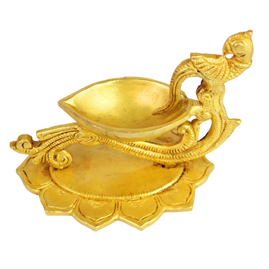 4 Inch Gold Color Brass Peacock Diya with Base: Small Size, Ideal for Home Temple Decor & Aarti