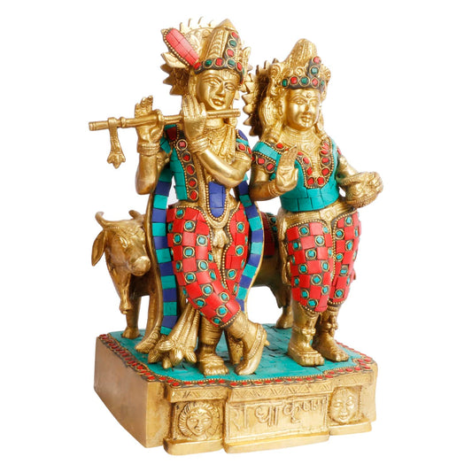 Brass Radha Krishna Murti with Gau Mata in Multicolor Height 11.5 Inch
