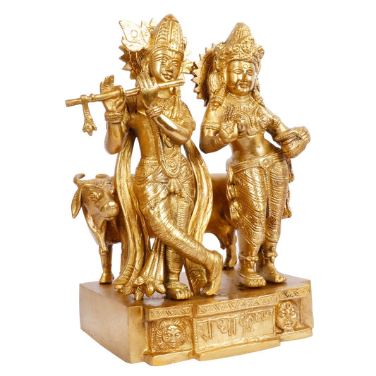 Brass Radha Krishna Murti with Gau Mata in Gold Color Height 11.5 Inch