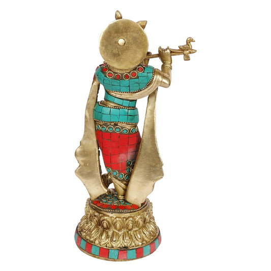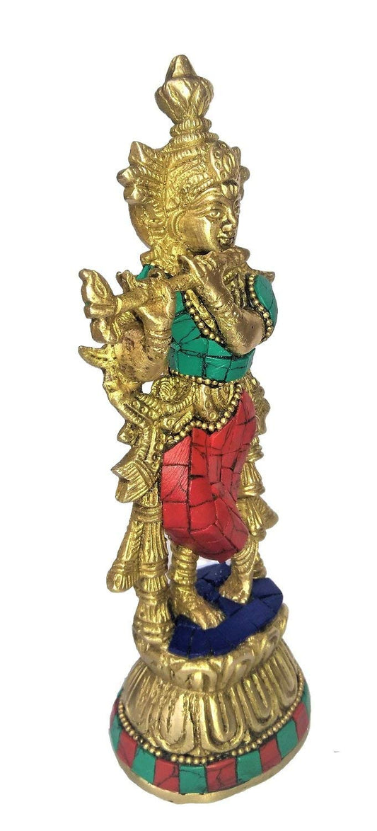 Lord Krishna Statue Playing Flute on Lotus Base Multicolor Gemstone Handwork Home Decor for Living Room Pooja Gift Item